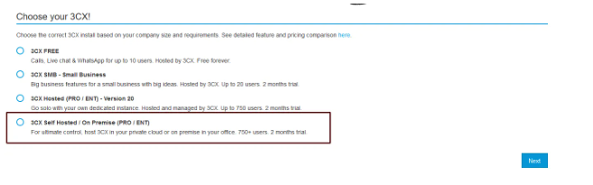 - Choose the 3CX Self Hosted / Οn Premise (PRO / ENT) Option.