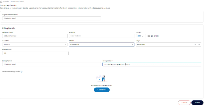 The Company Details section allows you to provide essential business information required for billing, taxation, and communication. Please ensure that all details are accurate and up-to-date to avoid any issues with invoices or correspondence.