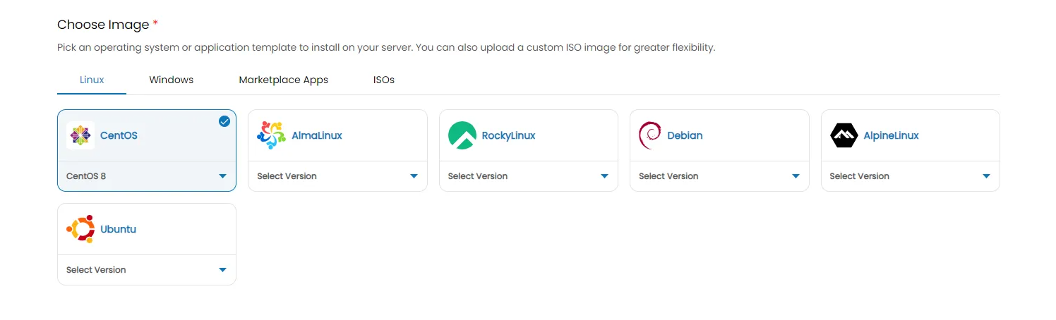 • Then you will have to select the operating system of your Instance. You can also select from the available Marketplace Apps Antyxsoft Cloud Platform provides or from an uploaded ISO that you provided.