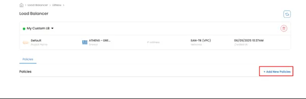 Upon Load Balancer creation, to configure new policies navigate to the Load Balancer menu and click option + Add New Policies