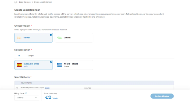 Finally, enter a name for the Load Balancer, set the Billing Cycle and click on Review & Deploy.
