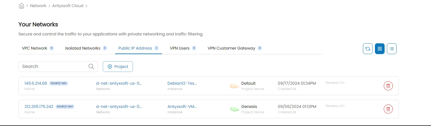 If you have given you instance a Public IP Address you can manage each aspect of it from the Antyxsoft Cloud Portal. To access this menu navigate from the side panel to Networks > Public IP Address and then click on the that you want to configure.