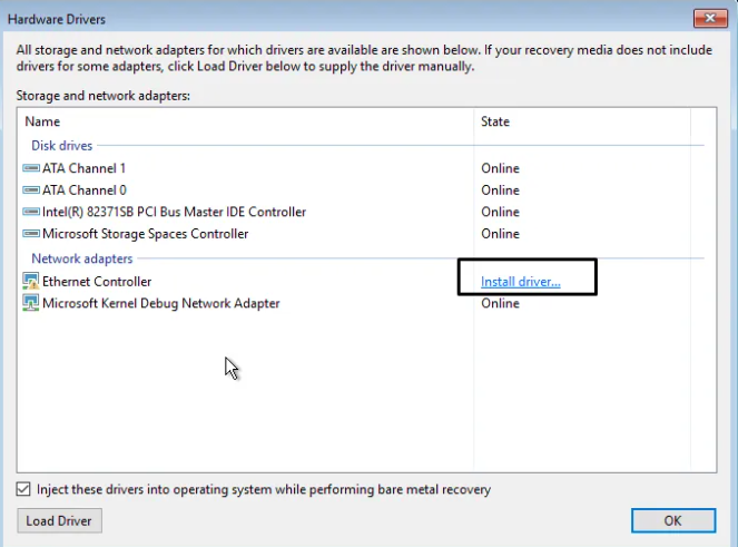 - After clicking Load Driver, a window named Hardware Drivers will pop up. On the ethernet driver, click Install Driver.