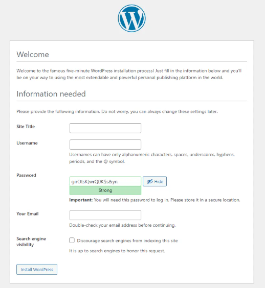 When you enter the requred information click on Install WordPress button. Finally, after the message of success you will be greeted with the login screen: